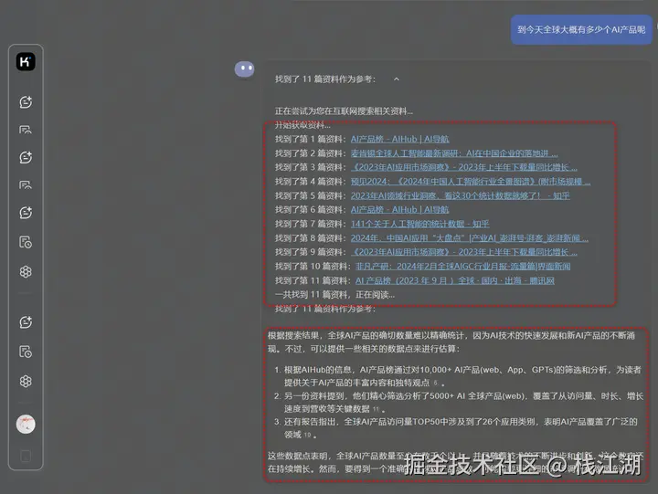 kimi看到kimi大家都会联想到timi,kimi是由国内企业月之暗面开发推出的,了解到它是有清华大学背景的。kimi访问起来比new bing还是要快了不少,毕竟国内先天的优势。 一般你提完问题后,它会去互联网搜索相应的资料,然后分析出相应的结果。所以可以看到有相关资料的列表及结论。 一直以来AI工具存在的一个比较大的问题就是它的知识库的问题,所以会出现胡言乱语的情况,kimi这套操作给我们的感觉就是它的回答非常真实。