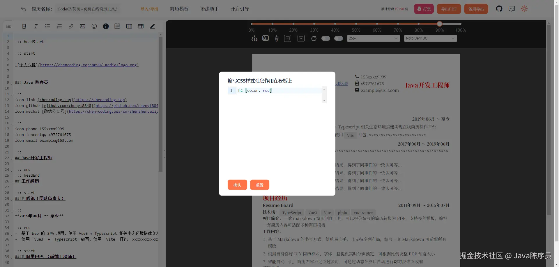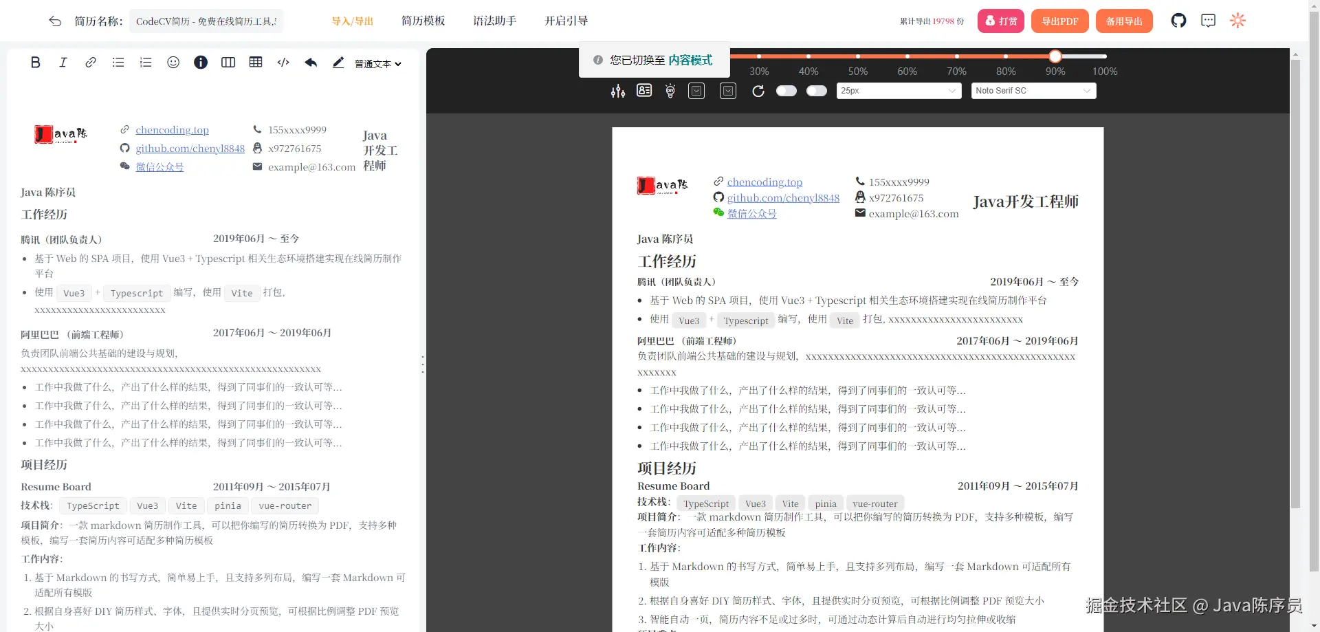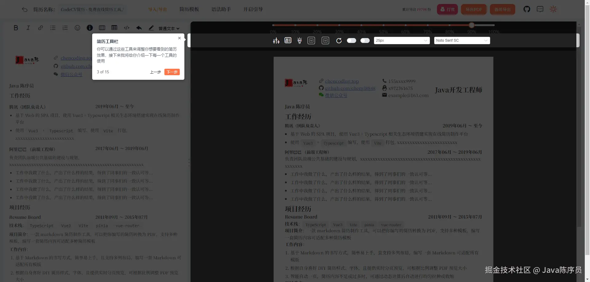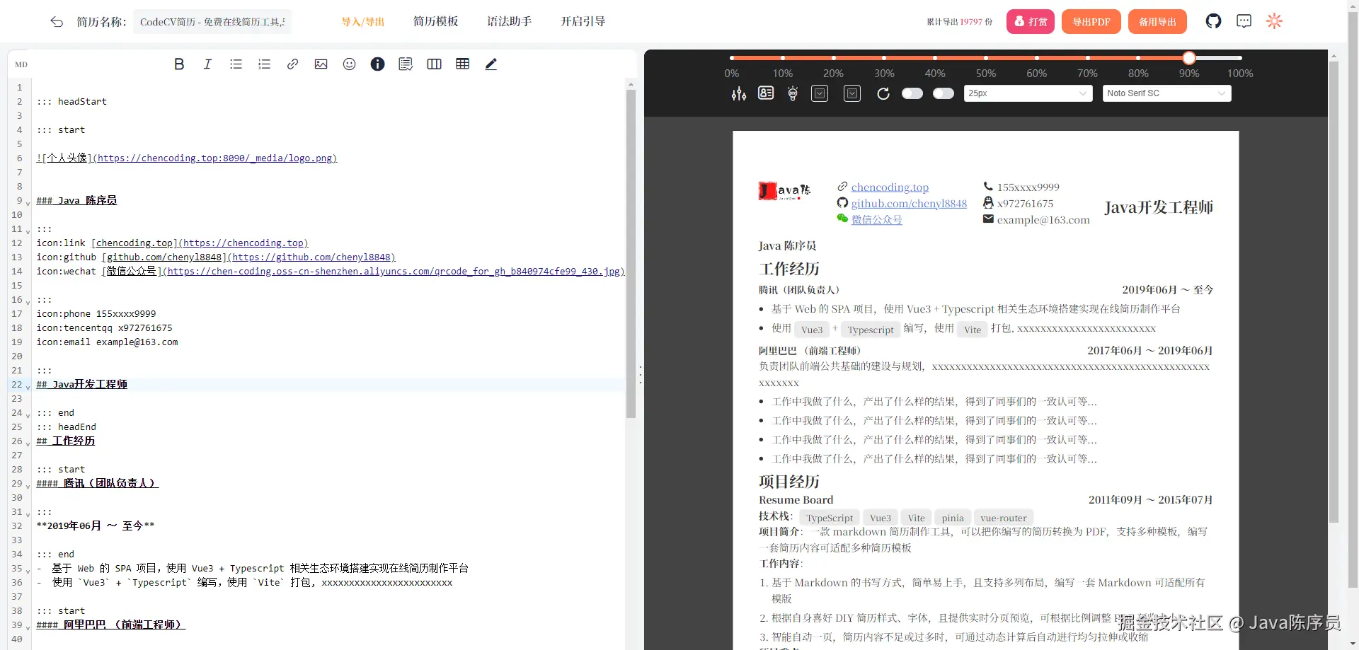 简历制作:有 Markdown 语法和富文本两种模式,支持使用引导、插入图标、编写CSS、导入/导出等功能。