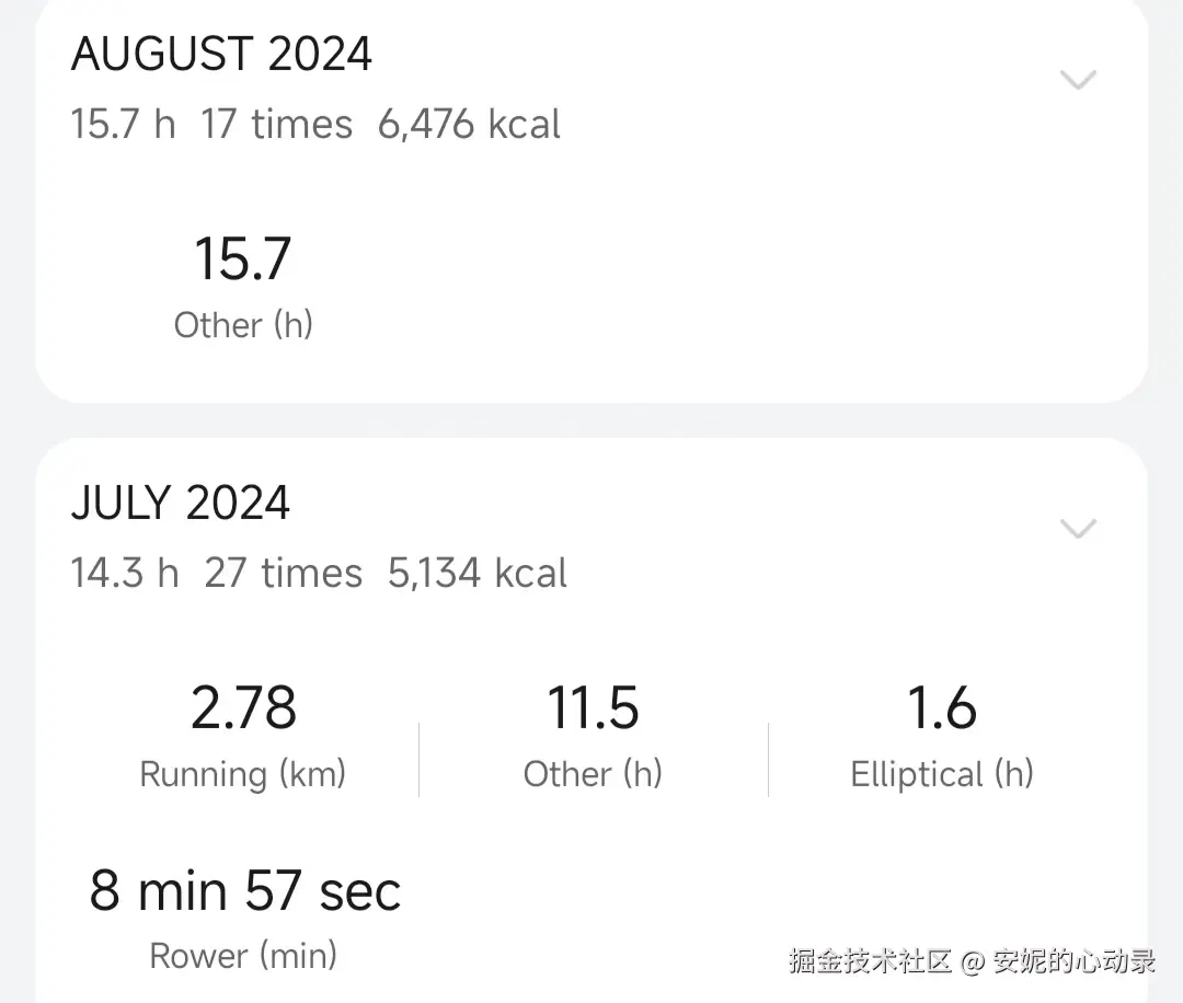 这两个月运动量明显比之前高了很多,大概每个月能有15h的样子,平均到每天就是0.5h/day,这对于一个死肥宅来说已经是莫大的进步了。