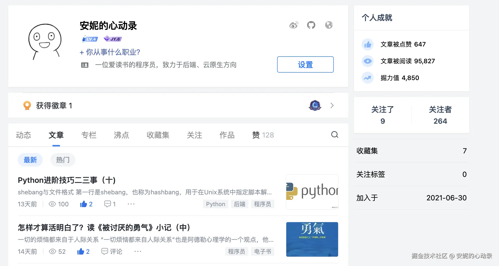 写作的话还是在掘金上不定期更新技术博客,但是阅读量没有那么多。一方面质量确实没有之前K8S系列那么高了,那个系列我是会讲解源码的,市面上能做到这点的博客并不多;另一方面我写的东西更偏向于自己需要的,而不是观众想读的,毕竟需要用到K8S的人更多的是运维,大部分人只需要了解常见使用方法,不需要二次开发,也就不需要了解的这么深。