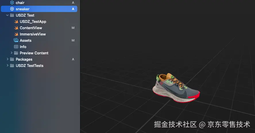 利用ModelEntity加载模型,添加到RealityView的content中展示,这样可以对模型做各种操作,比如添加子模型,修改光照,材质等要素。举个例子来讲,我需要在运动鞋模型“sneaker”上面添加一个可以与用户交互的白色圆点模型,用于在用户点击的时候添加/展示对应部分的评价。