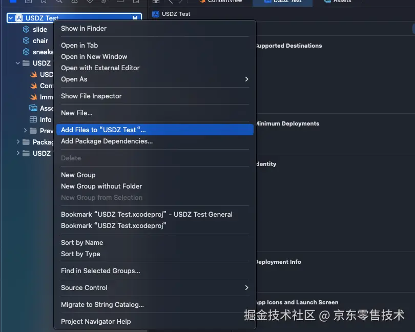 Xcode原生支持的3D模型文件类型是.usdz,支持编程的模型文件类型是.reality,右键点击工程,可以直接向工程里添加模型文件。