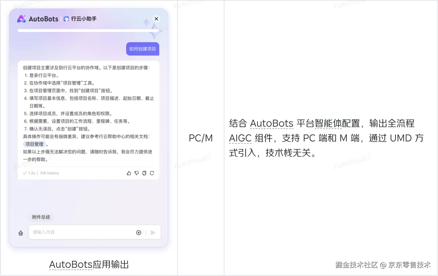 同时,我们调研了业界已经初具规模的6类 AIGC 组件库,分析了各类组件库的共性和差异,也梳理了京东内部平台能力,在京东零售前端通道的支持下,启动了基于内源共建的开放式跨端 AI 组件解决方案项目。项目命名为:AIGCDesign 。