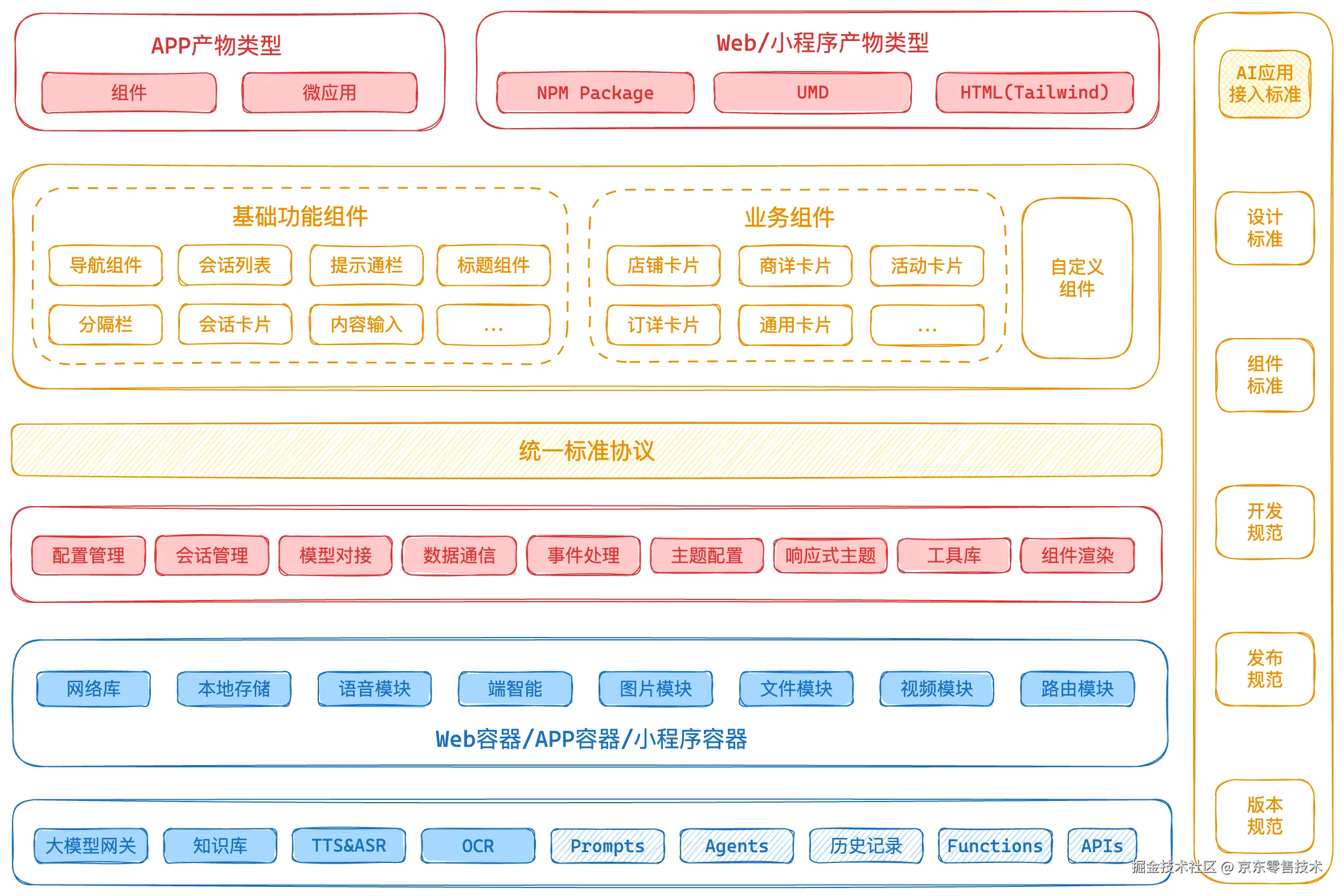 •容器层:支持多端多框架的应用容器,内部对接大模型平台,提供基础AI会话交互,开放会话区域的高度自定义能力。