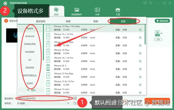 步骤二: 在 【输出格式】 里我们可以看到,系统默认的输出格式是mp4格式,我们不需要再修改。在转换间隙,我们可以根据自己的兴趣剪辑视频、添加效果。如果有在设备播放的需求,数据蛙还贴心地在 【输出格式】 → 【设备】 菜单栏里设置了很多常见的设备格式(如Apple、安卓、三星等),免除了用户调整格式的苦恼。