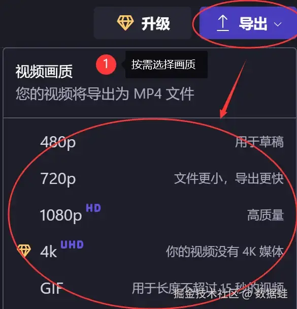 步骤三: swf文件怎么转换成视频?选择右上角的 【导出】 ,软件弹出显示,导出格式默认为 【mp4】 。点击选择视频的画质,完成格式转换。