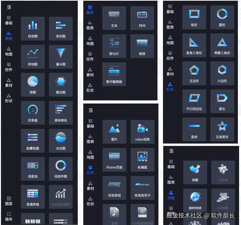提供多种图表、地图、控件、形状图形、素材库等可视化组件,满足企业不同的数据展示需求