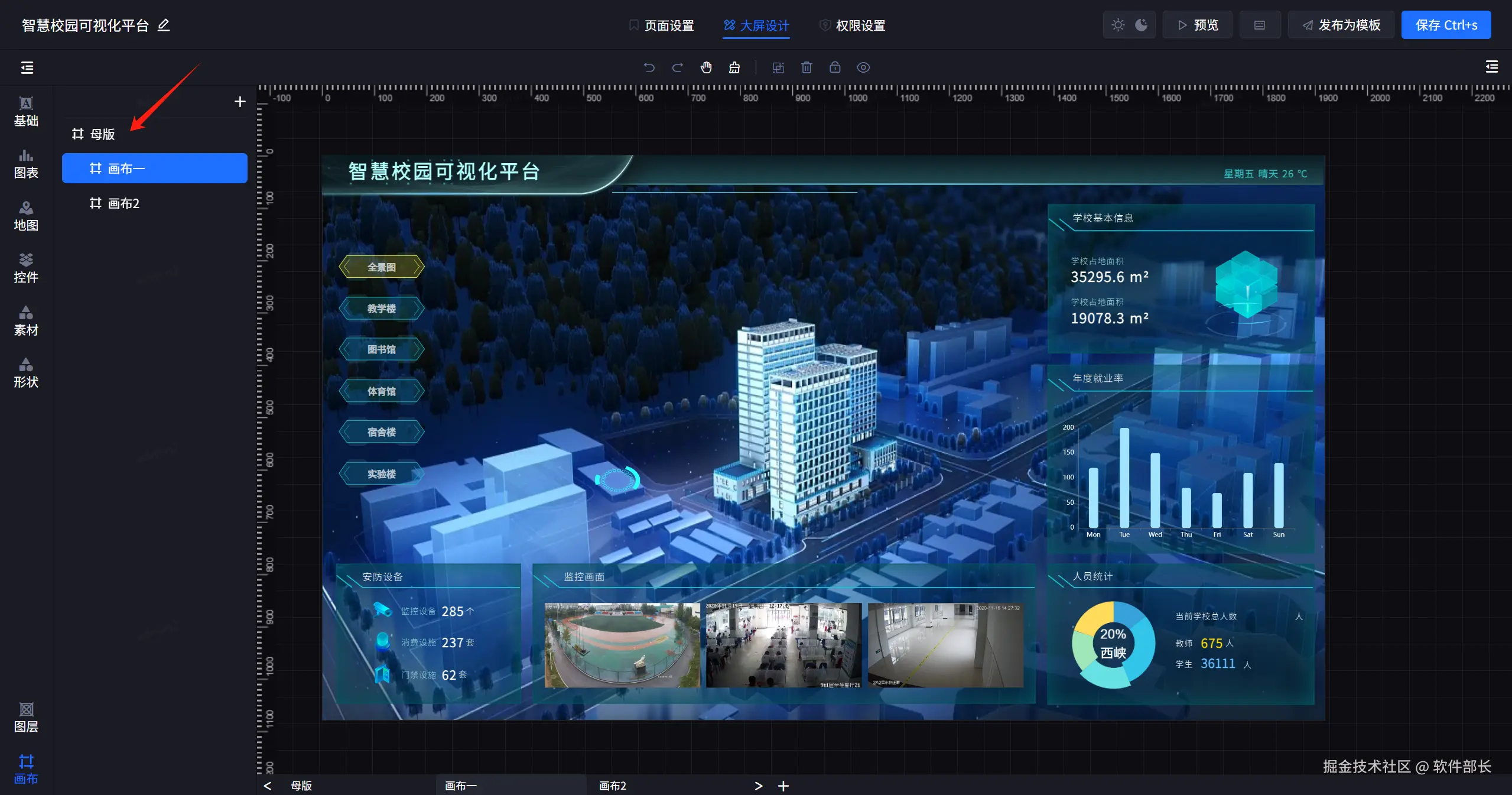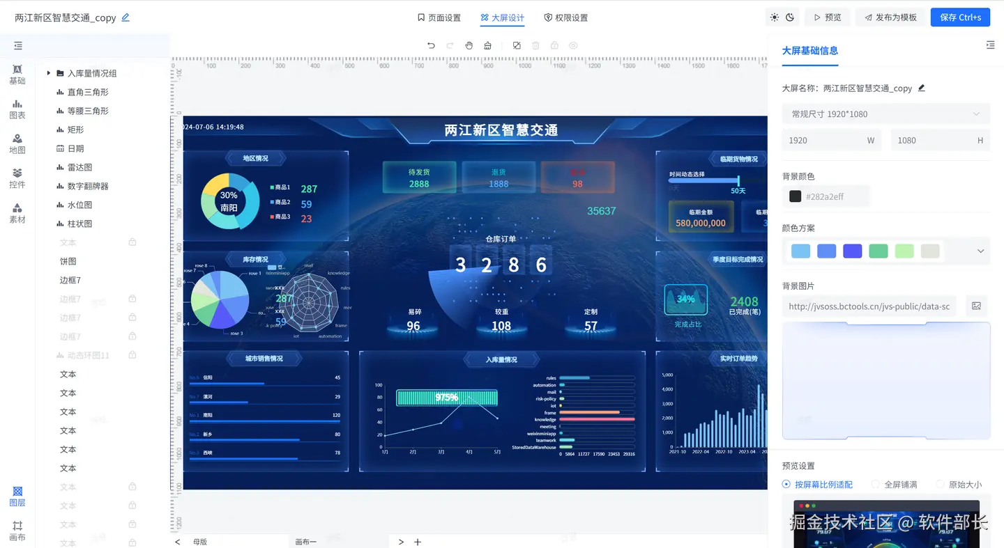 大屏配置的界面是可以包含多个页面的,类似于PPT的母版,多个“画布”之间是可以通过模板进行控制相同的内容,每个页面是可以有多个组件组成,每个组件是按照图层重叠的方式进行构建。