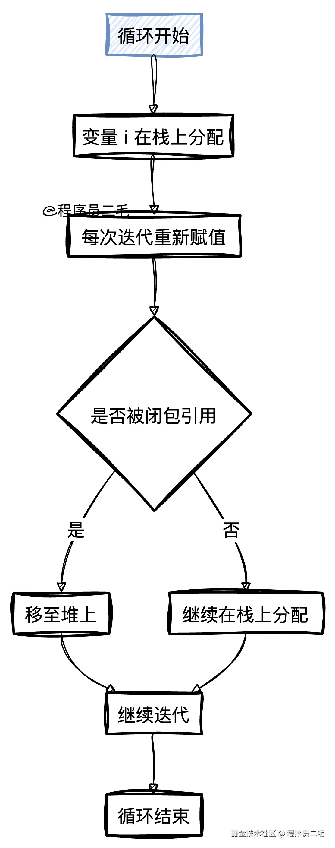 在Go中,for循环中的变量通常分配在栈上。每次迭代时,这些变量可能被重新赋值,甚至在某些情况下被移至堆上,特别是在闭包中使用时。