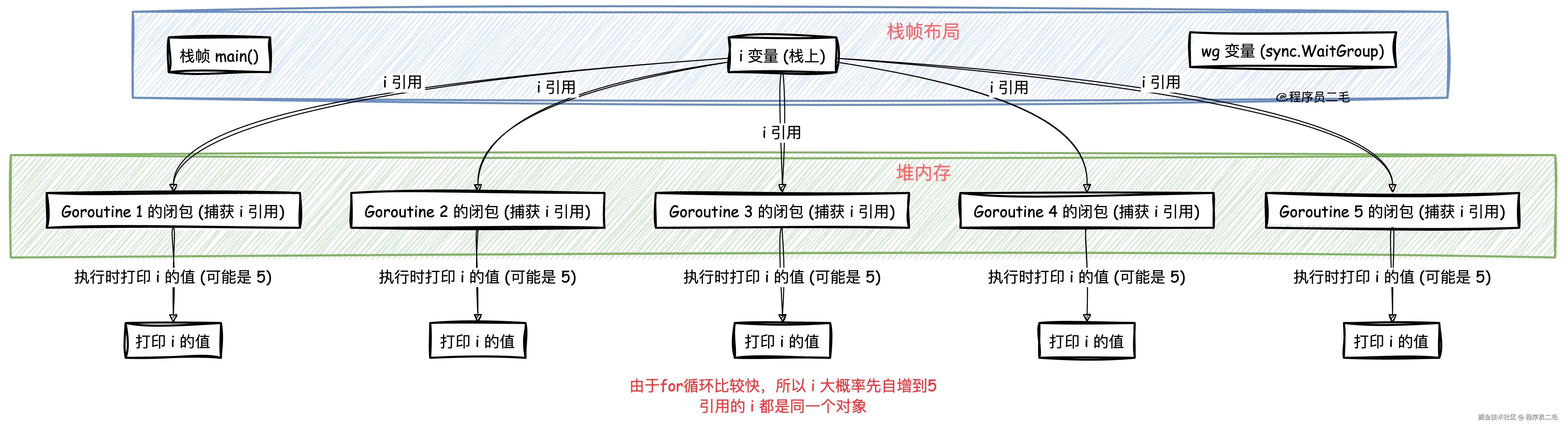 多个goroutine共享了变量i,因此输出的顺序和内容可能与预期不符; 也可以说是闭包,捕获了外部变量的引用,此时 i 却始终是同一个对象。