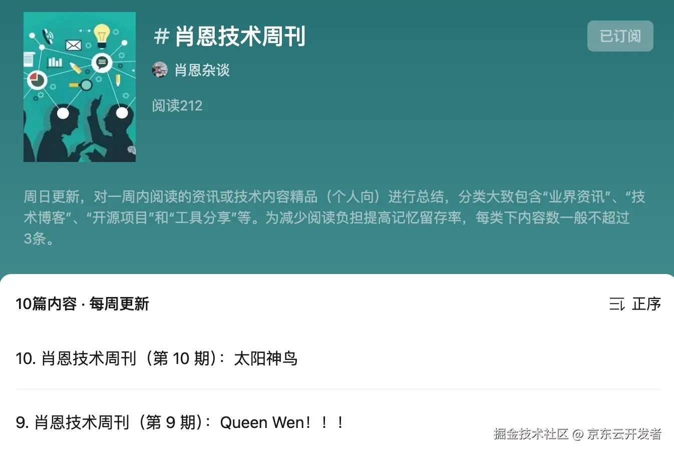写周刊的目的是提高知识的留存率,当然也能带来各种正反馈😁。目前已经坚持了两个月,虽然会牺牲周末半天时间且发布后也没啥阅读量😭,但基本的目的达成了,希望能保持下去。感兴趣的同学可搜索公众号“肖恩杂谈”订阅一下🥺,历史文章查看:技术周刊合集、shawn-weekly。