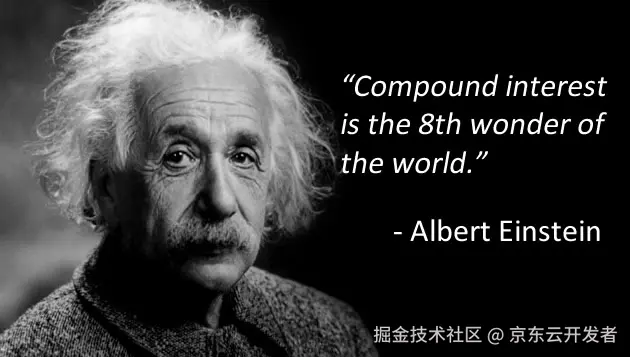 “复利是世界第八大奇迹”,谣传是爱因斯坦所说,但无据可查。不过不管是谁说的,复利本身带来的效果是可观的,下面是一个简单的复利公式(F为收益,P为本金,i为利率,n为时间)。
