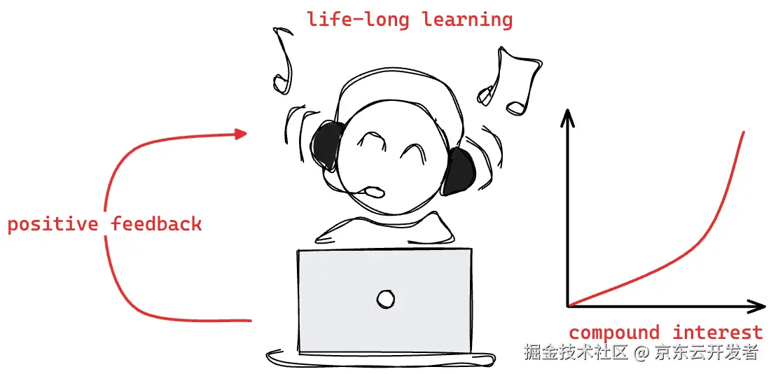 技术能力是开发的立足之本,因此前言中提到的寻求突破更多指的是技术能力上的突破,提升的方法我采取三步走:持续学习,制造正反馈,相信复利效应。