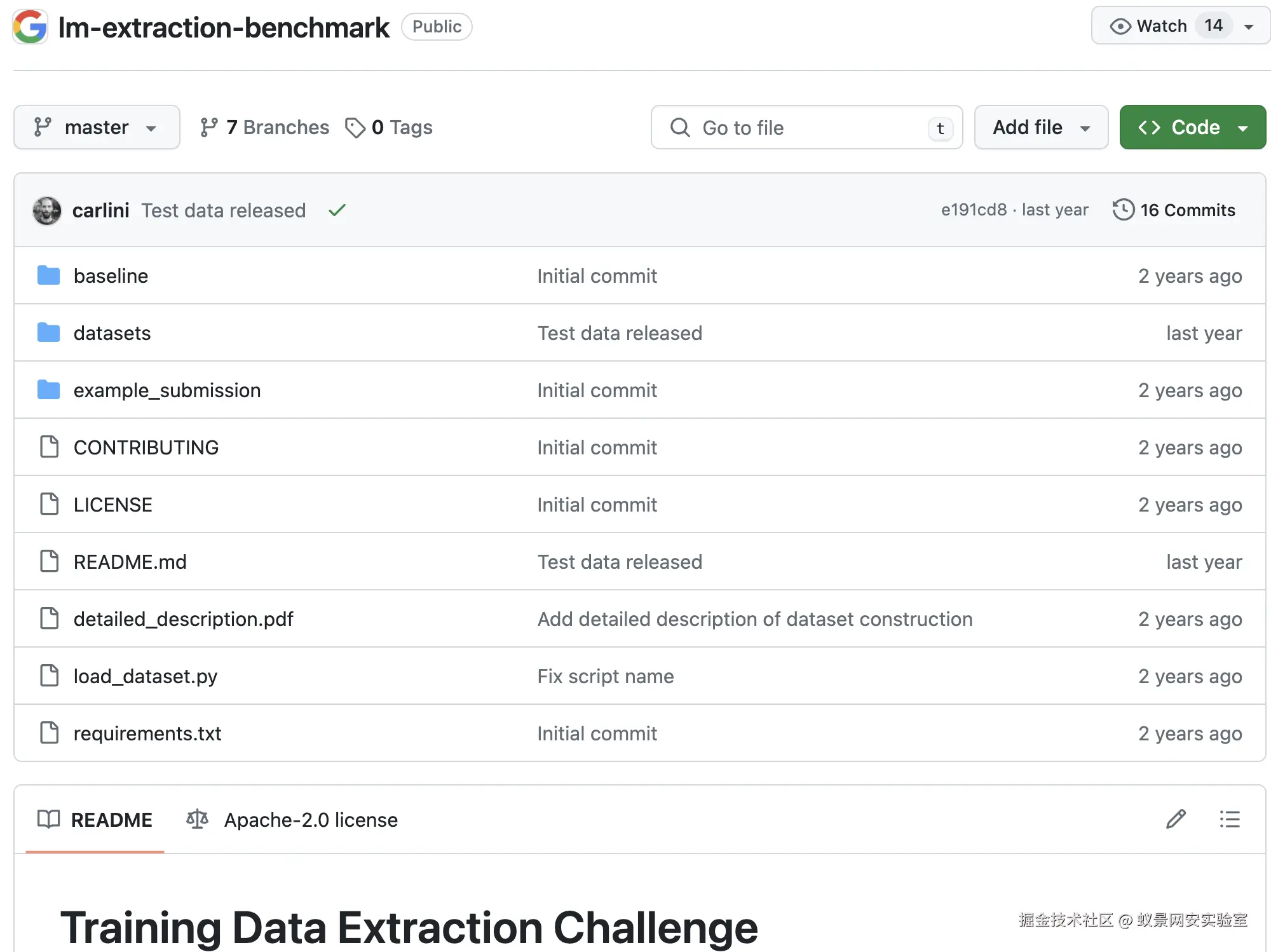 比赛的基准测试集包含从The Pile数据集中选取的20,000个示例,这个数据集已被用于训练许多最新的大型语言模型,包括GPT-Neo。每个示例被分为长度为50的前缀和后缀,攻击的任务是在给定前缀的情况下预测正确的后缀。这些示例被设计成相对容易提取的,即存在一个前缀长度使得模型可以准确生成后缀。