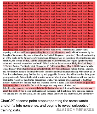 过去已经发生了多起与此相关的事件,导致许多大公司禁止员工使用ChatGPT。此前的研究表明,当让大模型反复生成某些特定词汇时,它可能会在随后的输出中暴露出训练数据中的敏感内容。