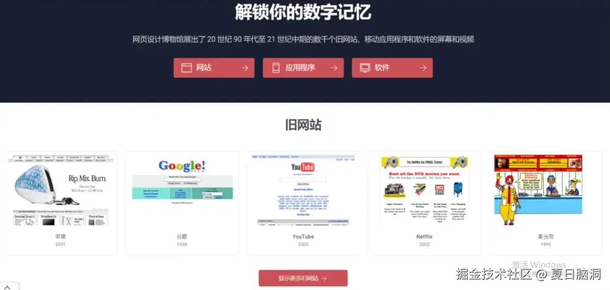 你想知道一些著名网站十几年前的样子么?这个网站就是收集网络上出名网站的历史网页,看看还挺有意思的。包括像苹果,谷歌,麦当劳等一系列品牌的历史网站都在上面,从网站的变迁上也能看出近现代设计风格的更新。