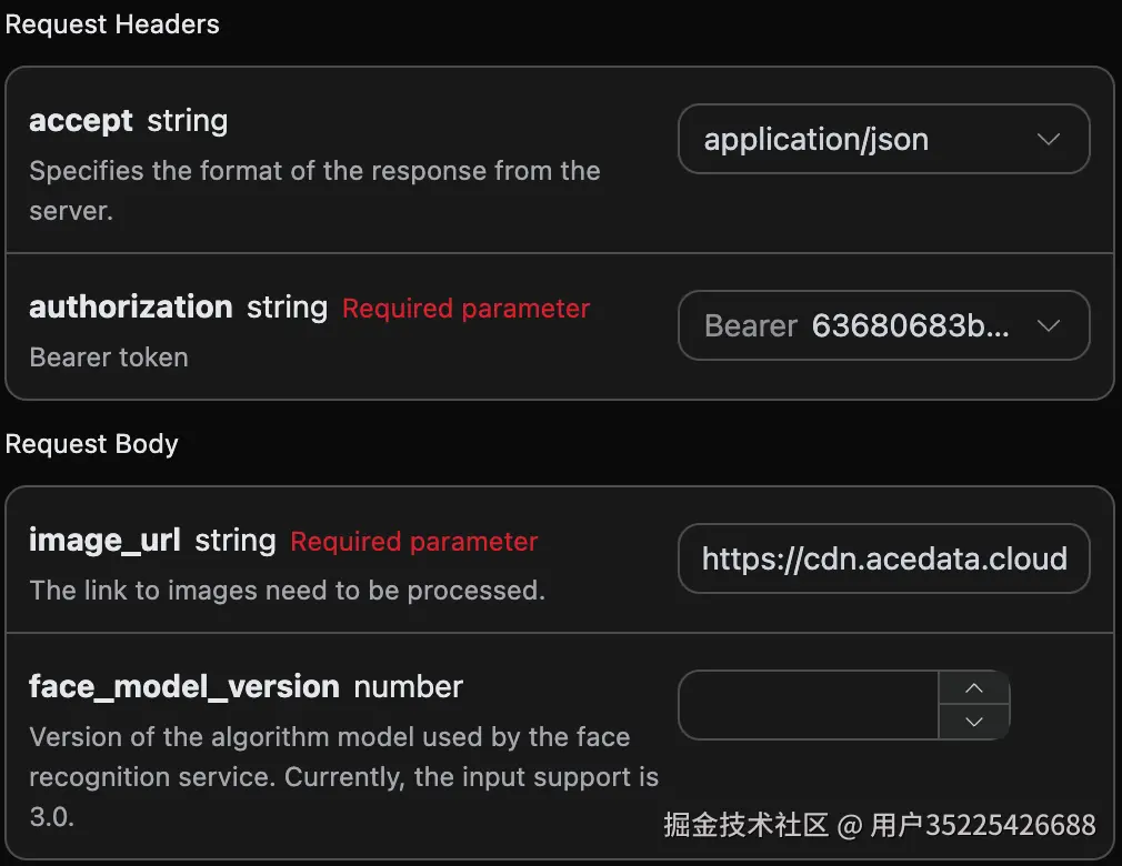 accept:想要接收怎样格式的响应结果,这里填写为application/json,即 JSON 格式。authorization:调用 API 的密钥,申请之后可以直接下拉选择。