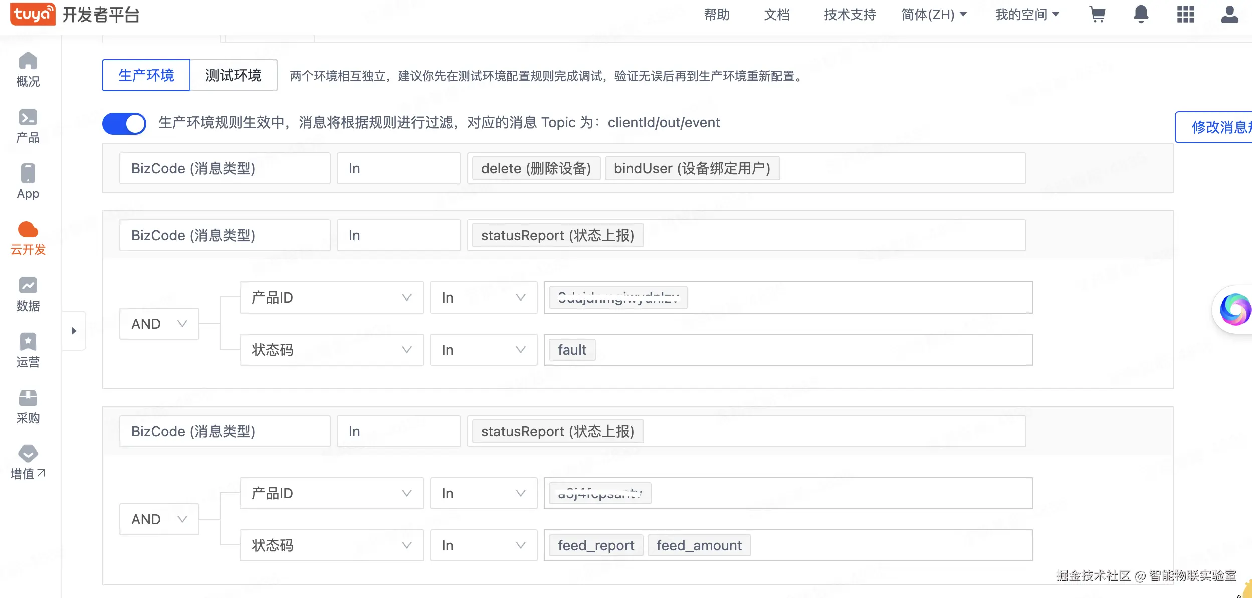 以消息量较大的 bizCode=statusReport 为例,你可能只关心故障告警(fault),而不关心其他的标准状态,那你就可以通过如下属性进行配置,以减少大量其他无关的上报消息。当出现食物短缺、设备电量低等情况,你就可以接收到相应的 Pulsar 消息,并在处理后及时通知用户。