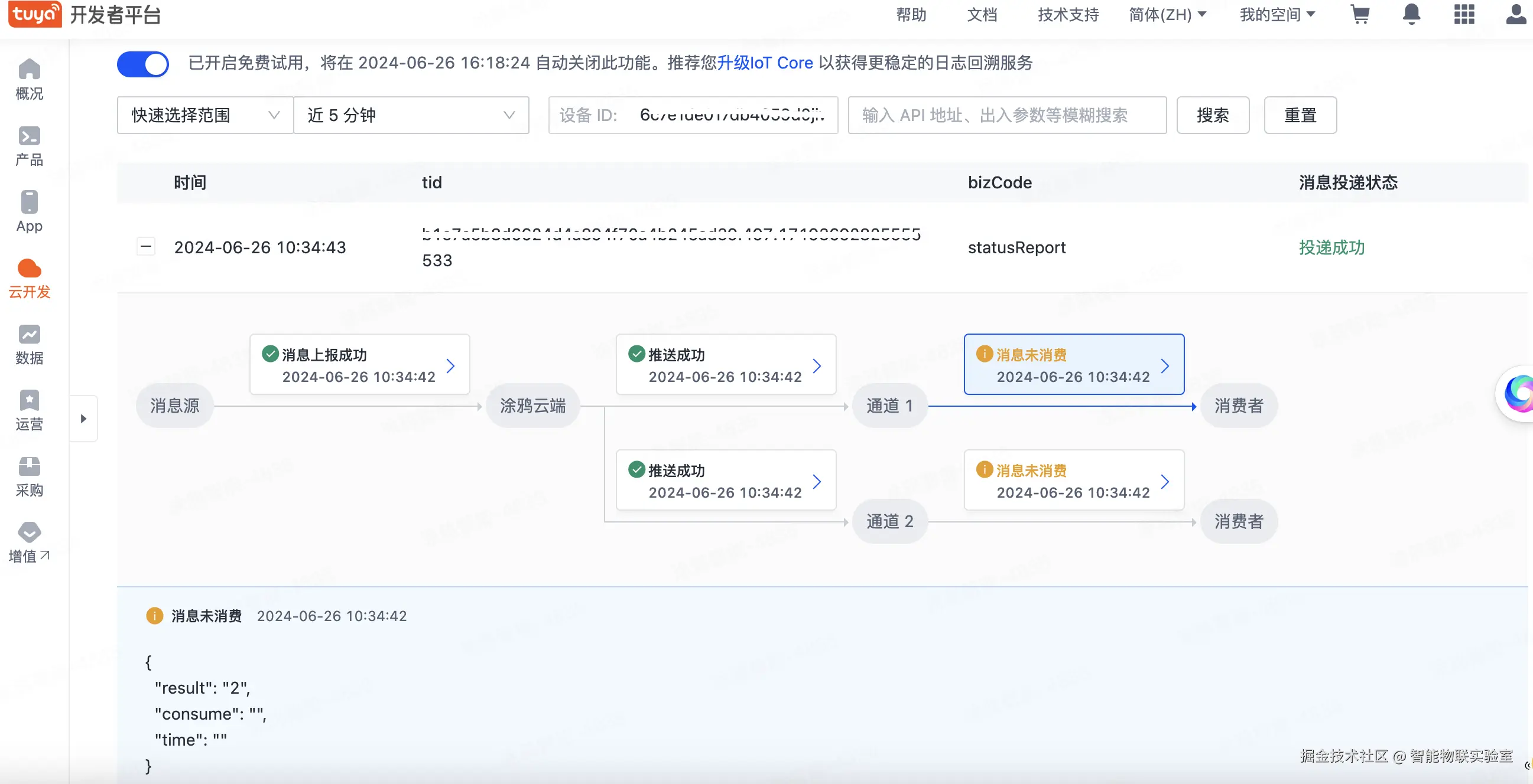 愉快地使用一段时间后,你可能会发现突然有一天信息异常,怀疑是不是消息哪里出现了问题?这时候推荐你使用涂鸦云开发者后台的日志回溯功能,来详细查看消息从涂鸦云到 Pulsar 的完整投递链路。这有助于帮你分析,并确定某些消息未被接收的具体原因。