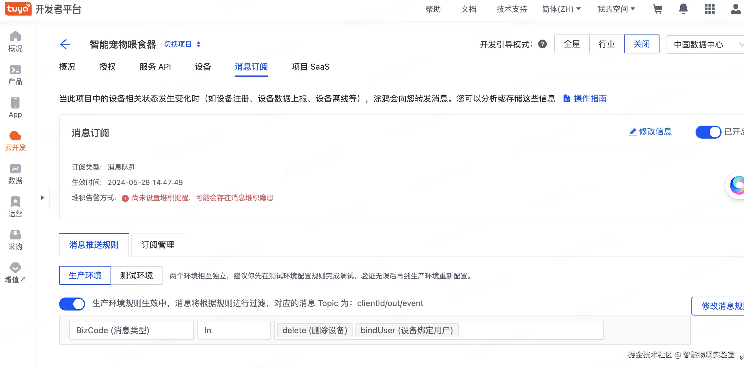 投入市场后,如果你想实时感知设备的各类信息,并及时通知用户,这时候可以考虑接入涂鸦 Pulsar 云消息(涂鸦云消息基于 pulsar 实现,具有高性能、可扩展、多租户隔离优点),按照如下步骤即可快速接入: