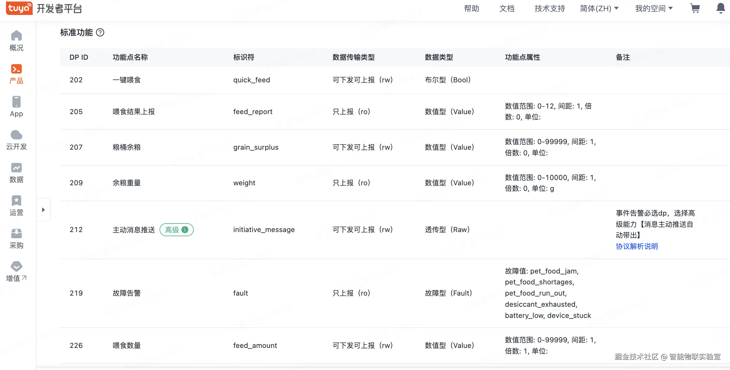 如果这时候你想开发中高端产品,增加通过分析历史信息(每天投喂次数 feed_report 和宠物每次食量 feed_amount)来检测宠物健康状态的功能,从而发现异常并及时通知用户。这时候你可以在涂鸦云开发者平台新建一个产品,把接收的 Pulsar 消息存储起来,通过一定的机器学习算法,分析历史信息和当前信息就可以实现了。