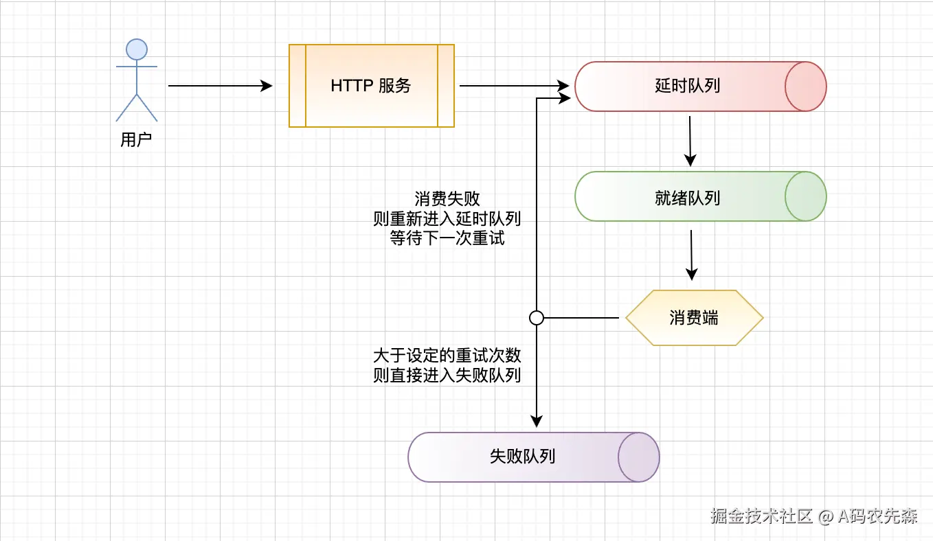 好了,我先介绍一下这次延时队列的实现逻辑。主要分为三个部分,一是:消息的发送,如果设置了延时时间则会将消息存储到 Redis 的延时队列中,反之会直接将消息推送到 Redis 的就绪队列中等待消费。二是:将到期的消息从 Redis 延时队列中取出,并且推送到 Redis 的就绪队列中等待消费。三是:消费端会从 Redis 的就绪队列中按顺序读取出消息,并且执行对应的业务处理逻辑,如果处理失败则会将该消息,再次推送到 Redis 的延时队列中进行下一次的重试。