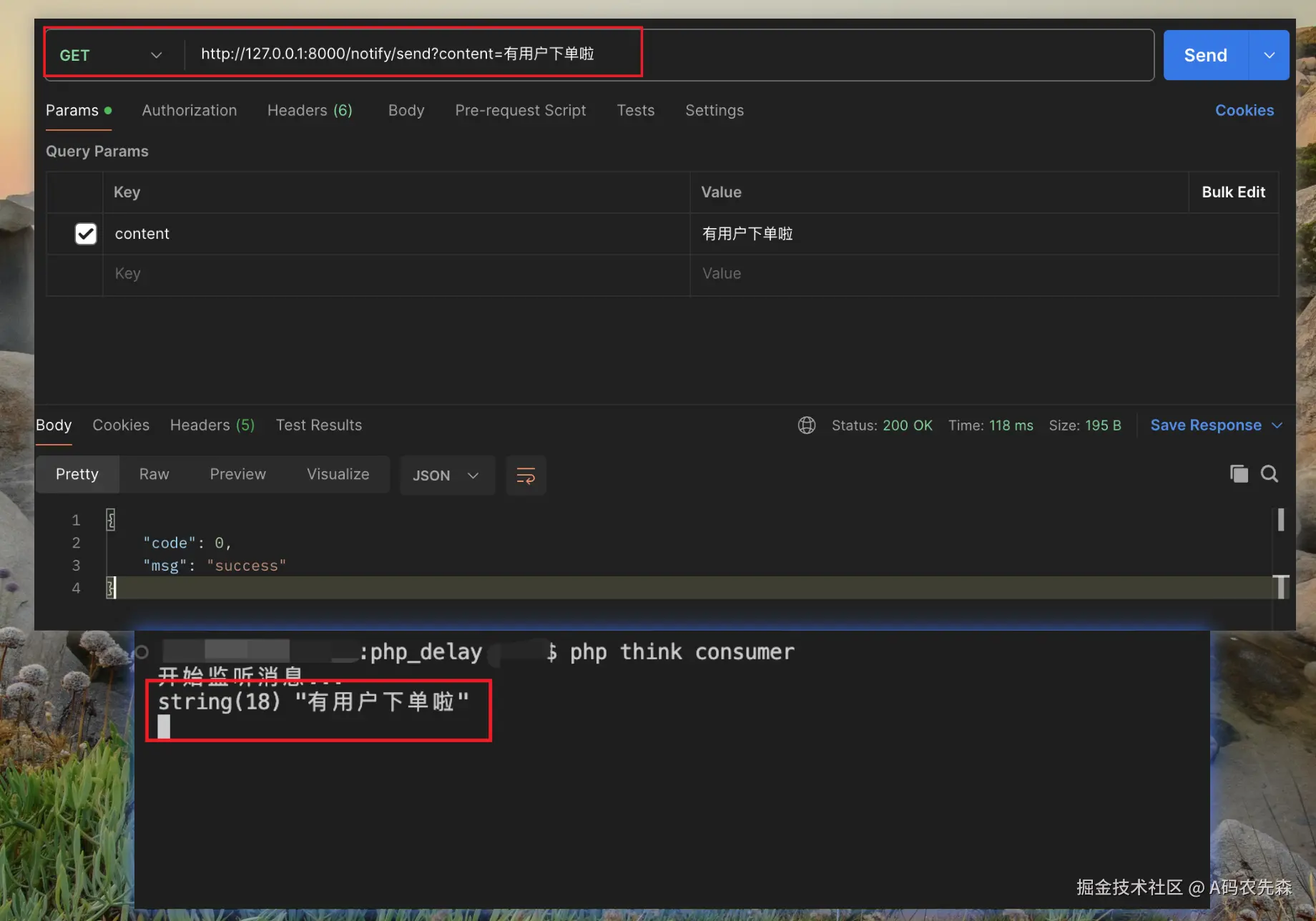 这个就是延时队列实现的核心类,定义了就绪、延时、失败三个消息队列。send() 方法用于发送消息,其中可以指定 $delay 参数设置延时时间单位是秒。wait() 方法用于消费端监听消息,从下面的代码可以看出这里还利用多进程,父进程的作用是每间隔一秒钟,就从 Redis 有序集合中读取到期的消息,并将该消息推送到 Redis 就绪队列,子进程则阻塞监听就绪队列的消息,并且将接收到的消息回调到用户自定义的业务函数中。