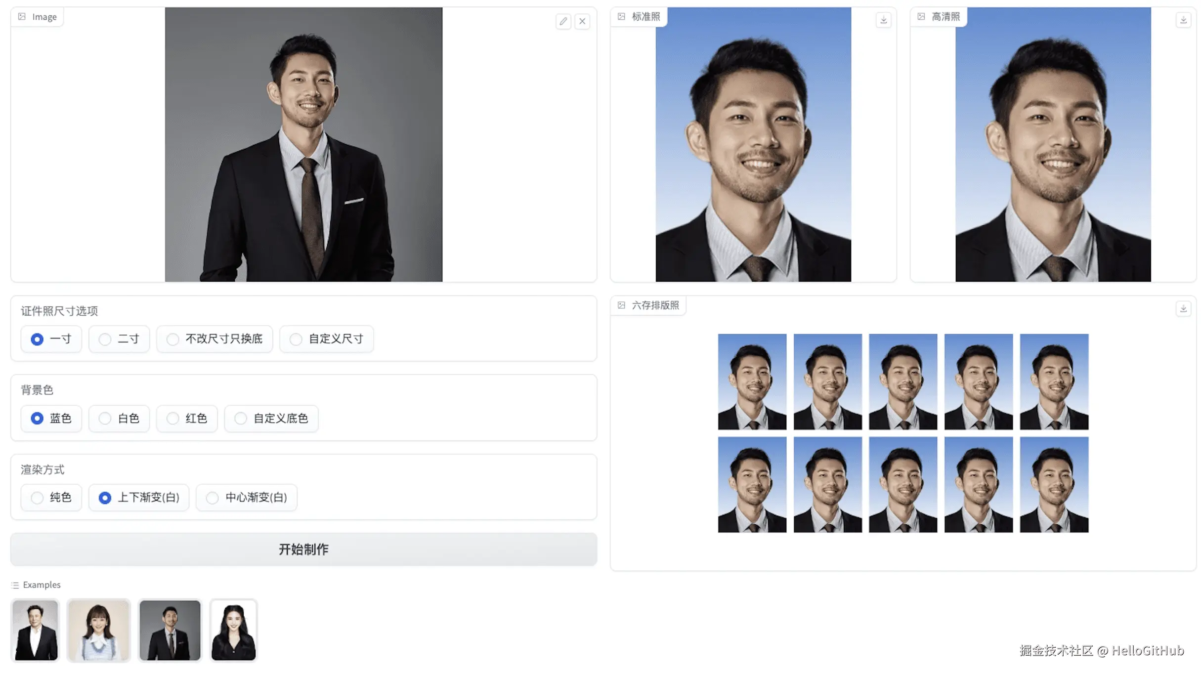 这是一款简单易用的 AI 证件照制作工具,能够生成标准证件照和六寸排版照。它提供了简洁的 Web 界面和 API 服务,即使在没有 GPU 的电脑上也能够运行,支持抠图、尺寸调整和自定义底色等功能。