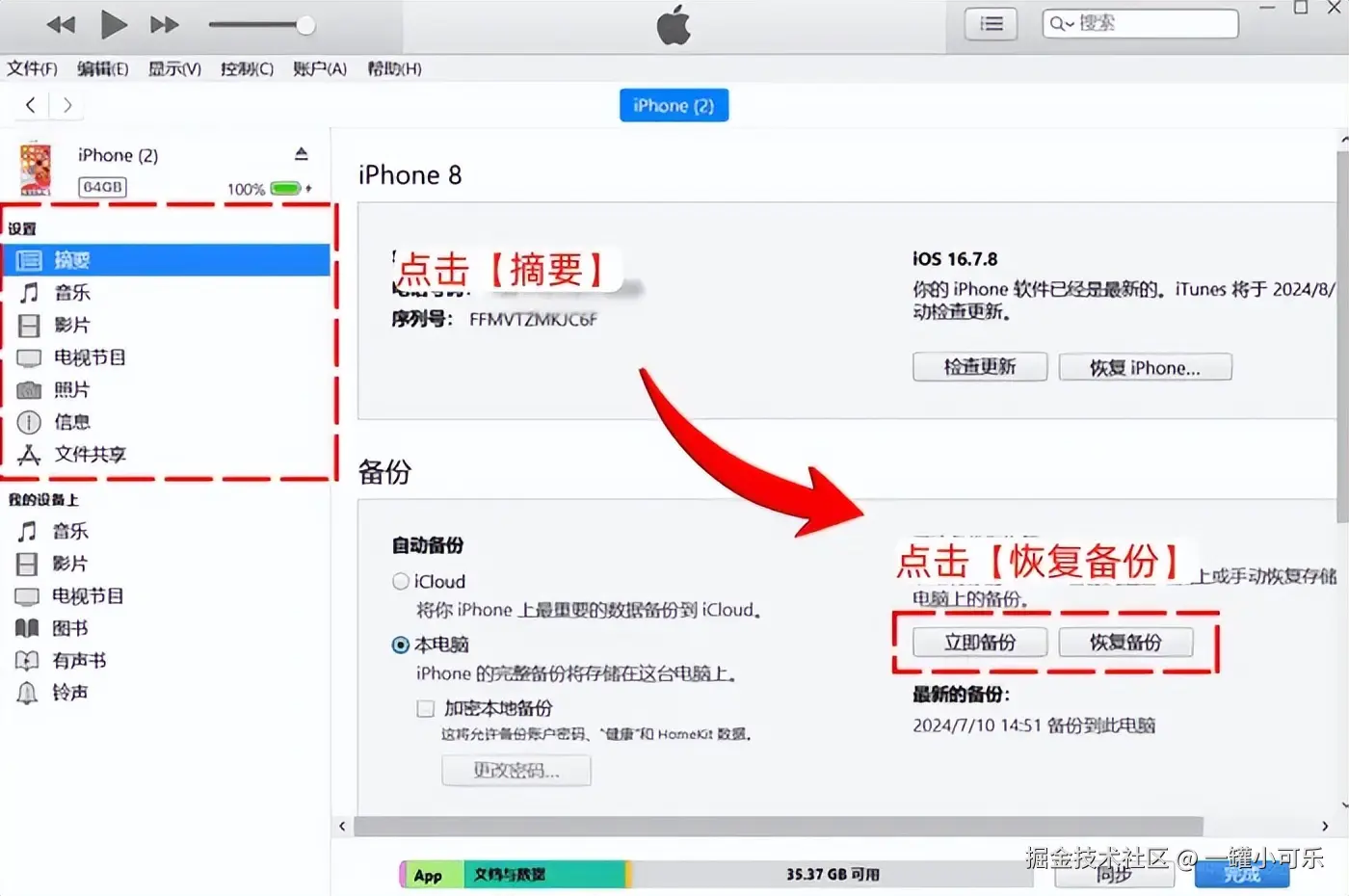 步骤2:在iTunes显示的界面上,选择 【摘要】 选项,再点击 【恢复备份】 即可。