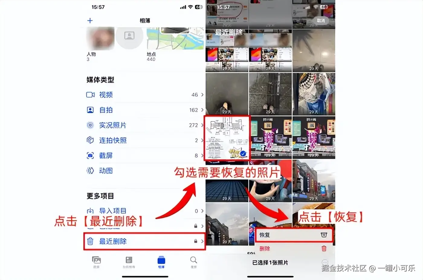 步骤2:在最近删除中找到需要恢复照片,确认后勾选,点击 【恢复】 即可。