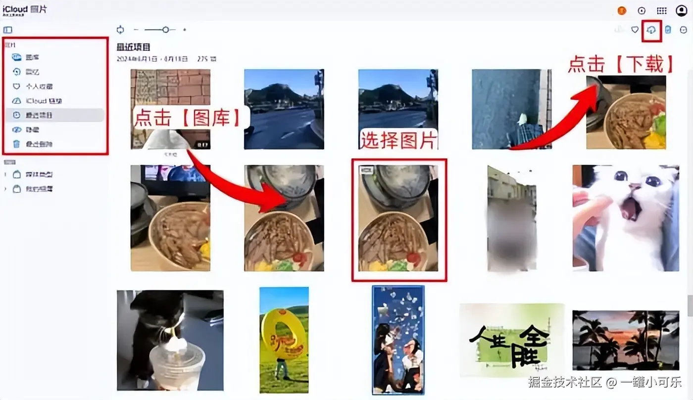 步骤2:在iCloud网页中,点击 【图库】 ,找到被误删的照片,点击 【下载】 就行。