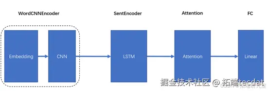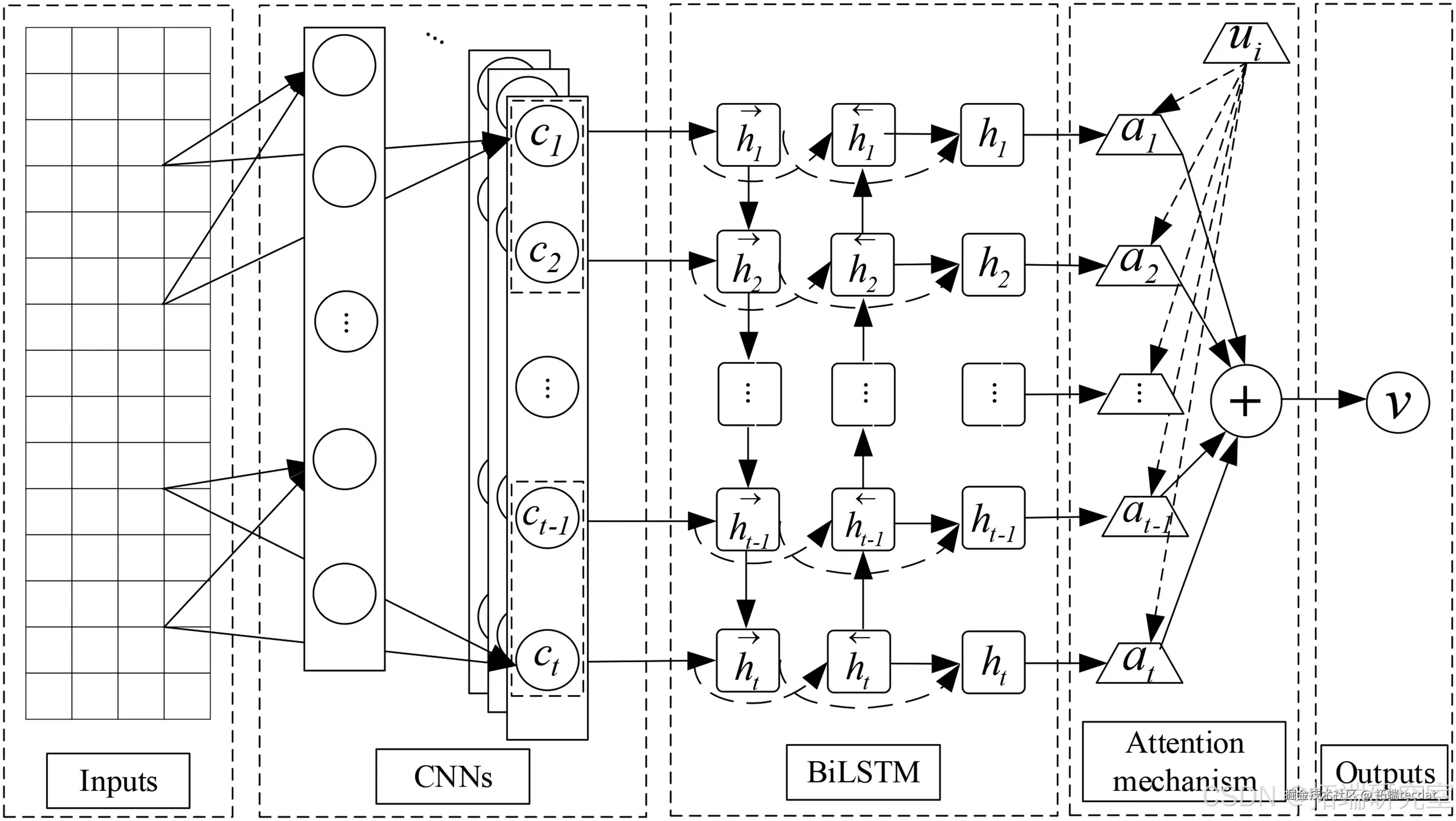 词向量输入CNN中,CNN中分别定义了3个大小不同的卷积核,经过卷积+池化后将3个向量拼接输入双向LSTM中。接着,经过Attention,在Attention中经过线性变化得到key,再将key与query相乘得到output,表示每个句子所分配到的权重,再进行softmax。最后进入FC层得到分类概率的向量。