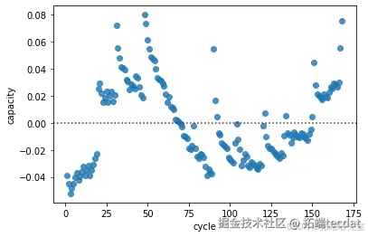 sns.residplot(dfB0005['cycle'], dfB0005['capacity'])