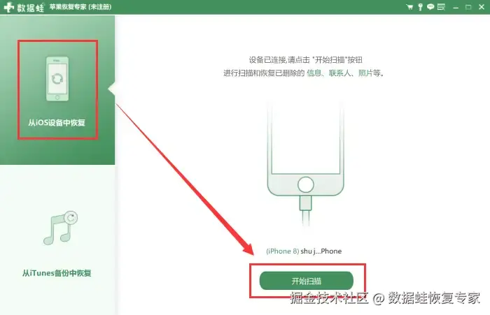 步骤1:将手机连接电脑后,打开软件,点击 【开始扫描】 ,耐心等待扫描的完成。
