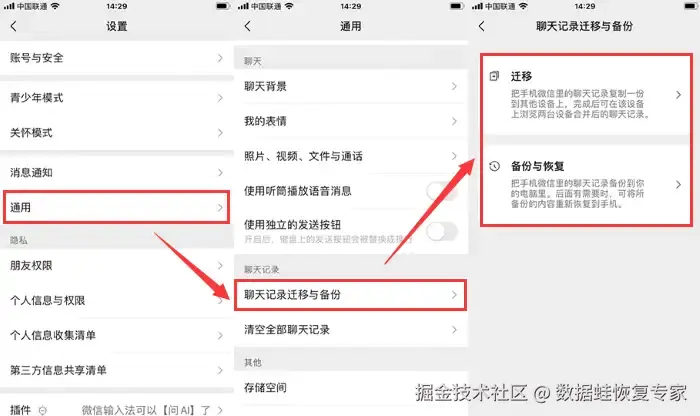 步骤2:打开微信,依次点击 【设置】>【通用】>【聊天记录迁移与备份】 ,选择 【迁移】 并按照提示操作即可。