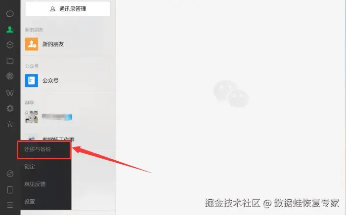 步骤1:确保您的电脑与手机微信已同步登录。在左下角找到 【更多】 选项,选择 【迁移与备份】 。