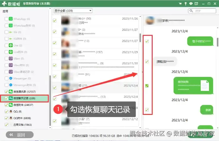 步骤2:扫描完成后,预览并勾选需要恢复的聊天记录,点击恢复即可。