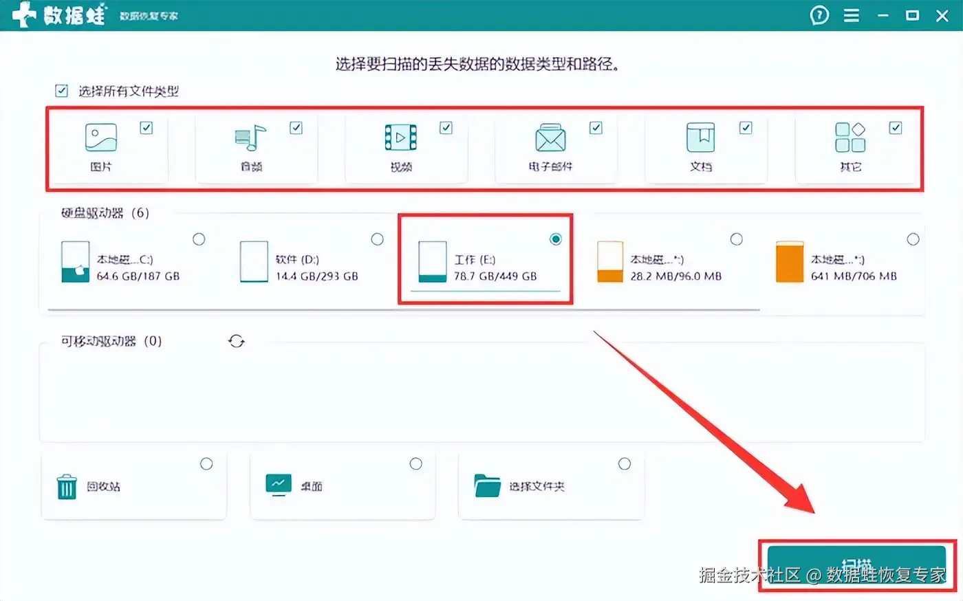 步骤2:启用软件,并选择需要恢复的对象,即文件数据类型和路径。确认完毕后,点击 【扫描】 并等待一段时间哦!