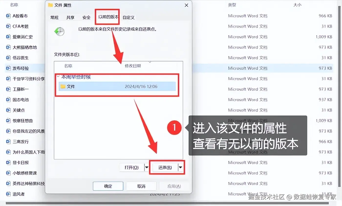 步骤2:在文件夹属性中,你可以点击 【以前的版本】 ,查看文件历史记录。最后,根据删除文件的时间,恢复其中一项记录即可。
