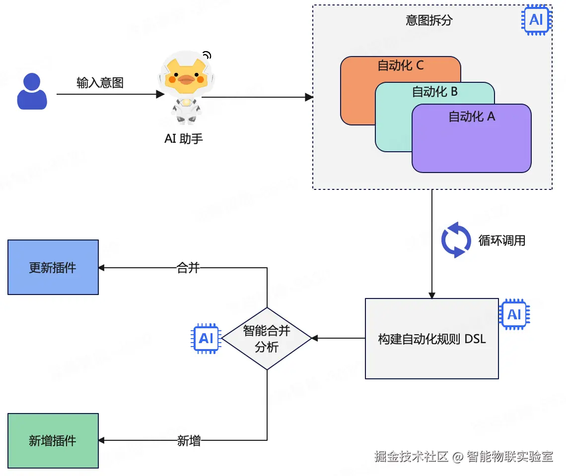- 1、自然语言表达意图:配置管理员可以不必了解触发条件、前置条件、执行动作这些场景自动化模型里的细节,开发体验也更人性化;