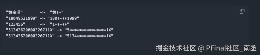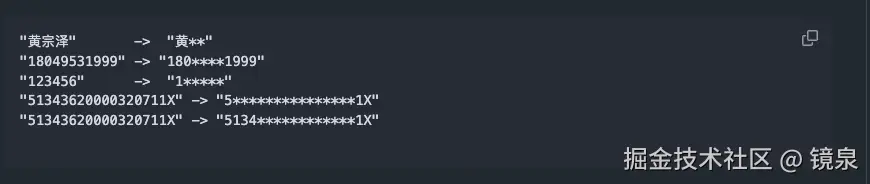 import ( "fmt" "pf_util" "testing")/** * @Author: PFinal南丞 * @Author: lampxiezi@163.com * @Date: 2024/9/2 * @Desc: * @Project: pf_util */func TestDesensitizedUtilUserId(T *testing.T) { d := pf_util.DesensitizedUtil{} res := d.SetType(0).Desensitized("10000") // 0 不暴露 fmt.Println(res)}func TestDesensitizedUtilName(T *testing.T) { d := pf_util.DesensitizedUtil{} res := d.SetType(1).Desensitized("黄宗泽") // 0 不暴露 fmt.Println(res)}func TestDesensitizedUtilIDcard(T *testing.T) { d := pf_util.DesensitizedUtil{} res := d.SetType(2).Desensitized("51343620000320711X") // 5***************1X fmt.Println(res)}