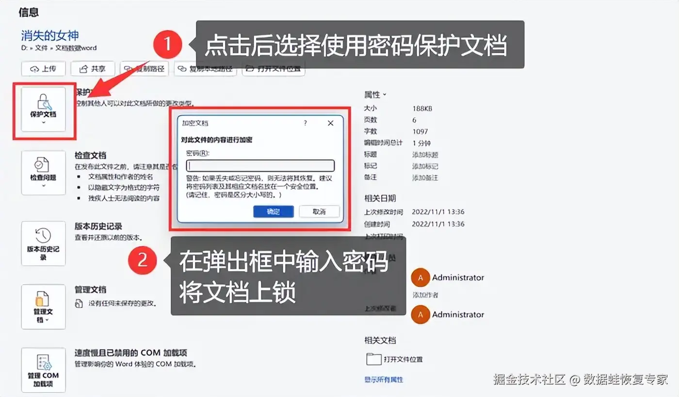 步骤1:在文档左上角选择 【文件】 ,在新页面中点击 【信息】 ,然后点击 【保护文档】 。