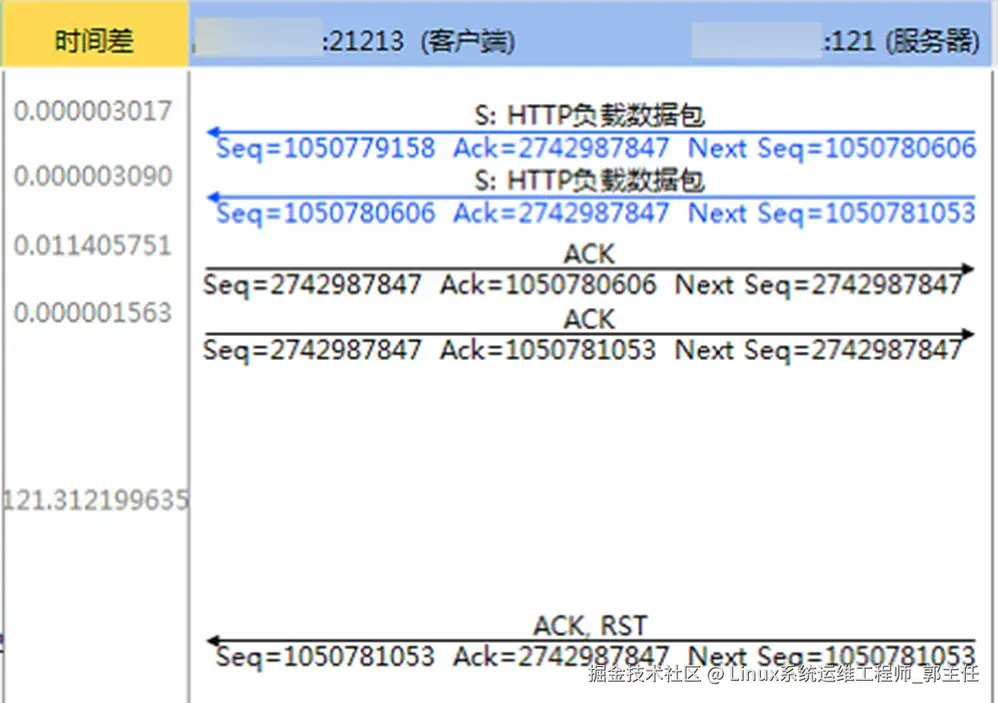 - 连接长时间无数据交互:当客户端和服务器之间长时间(例如120秒)无数据交互时,其中一方可能认为会话超时,会向发送RST包重置连接。如图6所示。在客户端和服务器中间流量经过负载均衡或防火墙的场景,RST包也可能由负载或防火墙发出。