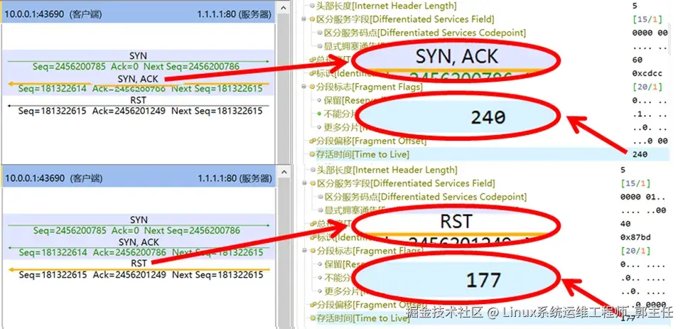 如果要问,为什么能判断这个RST一定是旁路阻断包,那可以仔细观察这些RST包,本文图1、图2、图4、图5、图6中的RST包,均为携带RST,ACK这两个标志位的“真RST包”,而图3、图7中的RST包是仅携带RST标志位的“假RST包”,另外,如果能够对比RST包和SYN/ACK包的IP TTL,则可以发现这两个包的IP TTL可能不同(也有部分设备能对TCP RST包的IP TTL拟真),说明其来自于两个不同的网络位置,如图8所示: