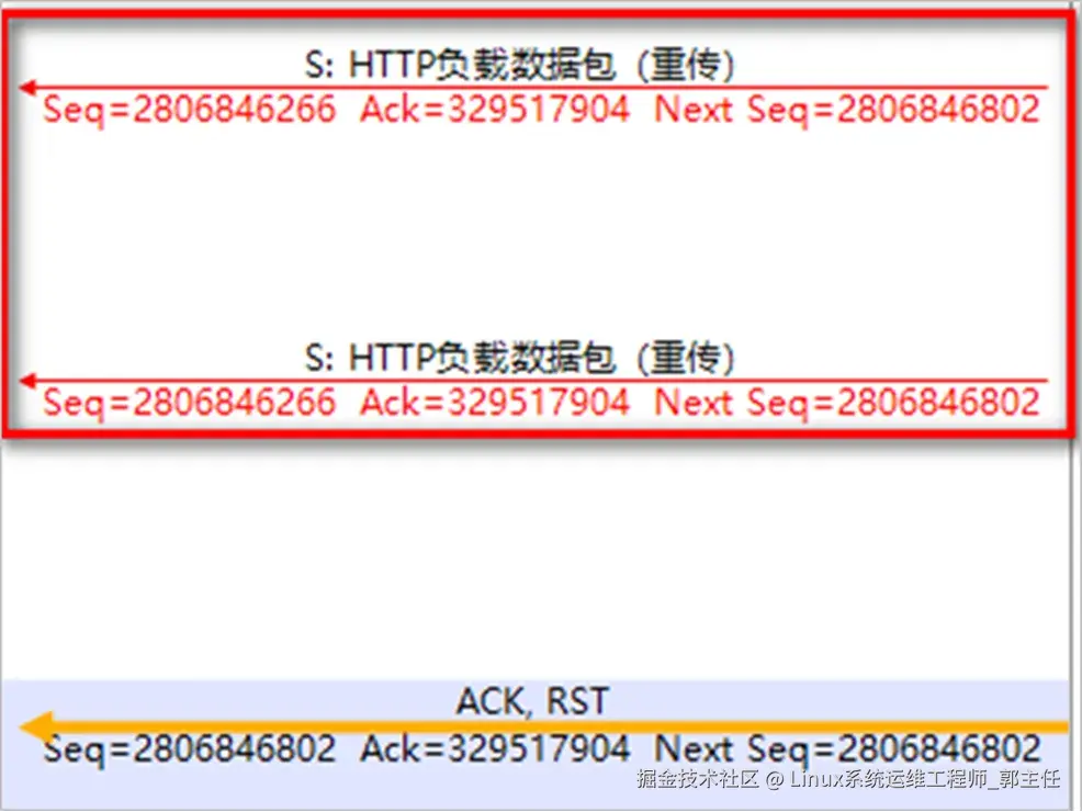 - 重传次数超限:TCP具有重传机制,当TCP尝试多次重传而无法收到对方的确认(或对方发来的确认无法被接收处理,例如序列号错误、校验和错误等种种字段错误)后,重传的一方将会认为连接出现错误,停止重传并发送RST包重置连接。如图5所示。