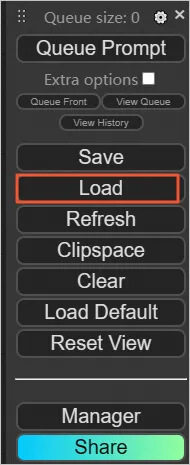 2.在页面右下角,单击Load,将下载并解压后的json文件导入到 ComfyUI 中。