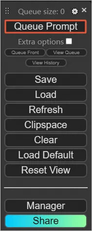 3.在页面右下方,直接单击 Queue Prompt,通过默认的提示词生成图像