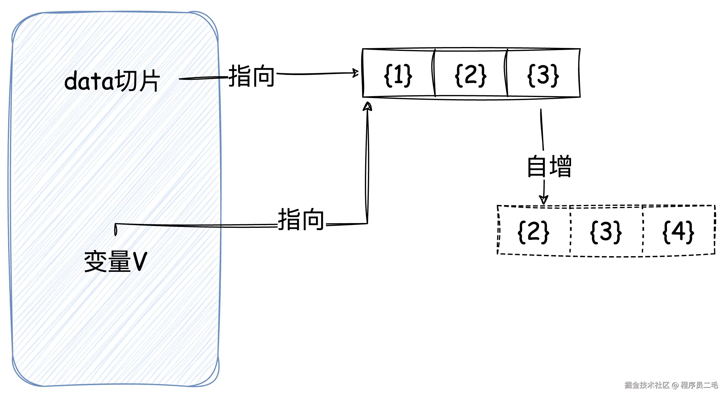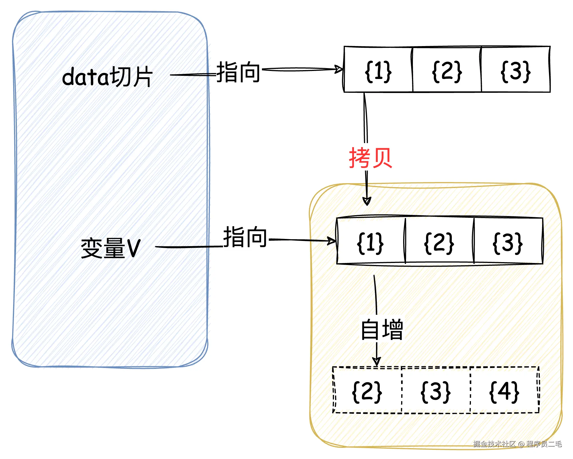 slice结构,意味着len是不变的。在循环中,不受后续slice长度变化的影响。 go语言会额外创建一个新的v2变量存储切片中的元素值。