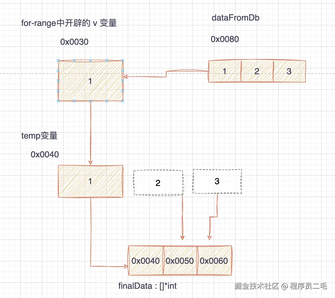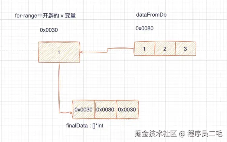 虽然每次循环都会把 dataFromDb 变量中的元素赋值到 v 中,v被不断刷新着数据,但是 v 的地址是不变的,所以 finalData 最终都存储着相同的地址:0x0030。