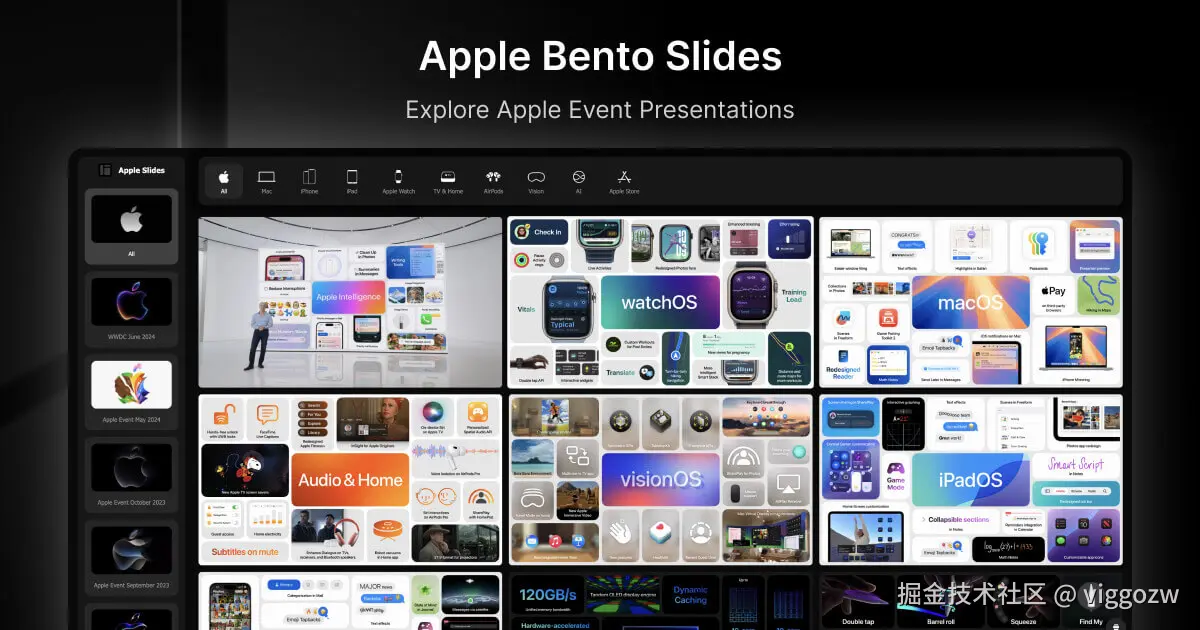下周苹果发布会了,我做了一个网站Apple Bento Slides,,通过便当盒样式布局展示苹果发布会的幻灯片。提供时间和类别过滤功能,支持动态加载图片,设计简洁美观,适合科技爱好者和苹果粉丝使用。